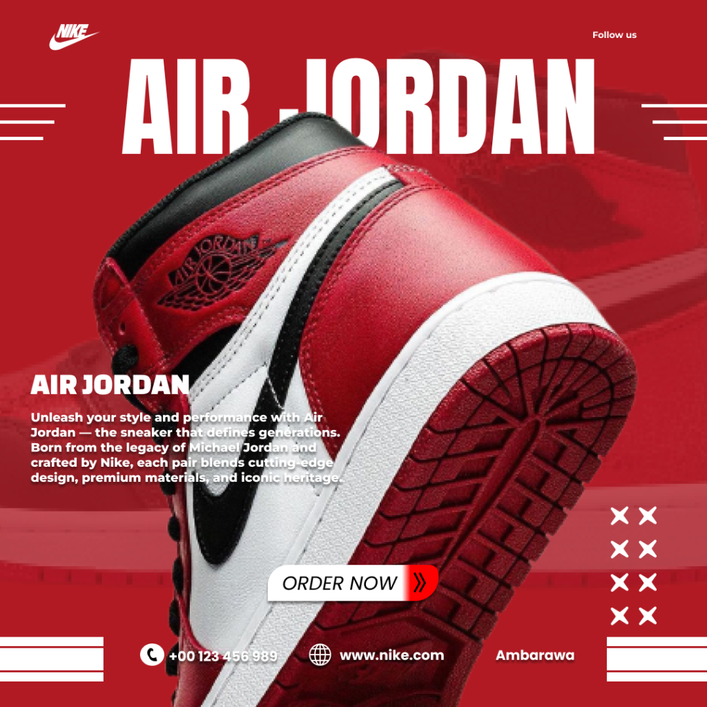 Hello everyone, so in this multimedia project I made a Marketing Poster, so after making this poster I have to explain the contents of the poster, and other parts, such as the most important objects in the poster, hierarchy, and many more. here I use 1 shoe product, namely Nike with its version, namely Air Jordan, When I made a marketing poster about Air Jordan, it was quite easy to find the color, because the color of Air Jordan was red, so it was easy for me to make it, and when making it, we also have to pay attention to which object to highlight, for me it was the back of the shoe, with the full shoe behind it so it was quite interesting, okay that’s my Air Jordan poster