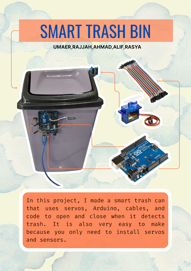 hello gays so this time I made a project or assembled a trash can, but this is not just an ordinary trash can, this is what we can call a SMART TRASH BIN, so the term is this is a smart trash can, why do I call it a raft, because if we want to make this smart trash can, of course we will make a hole or cut it, now in the smart trash bin there are 3 main items, namely Arduio uno, Servo, and Ultrasonic sensor, and the rest are jumper cables, for the coding it is very easy, we just use logic